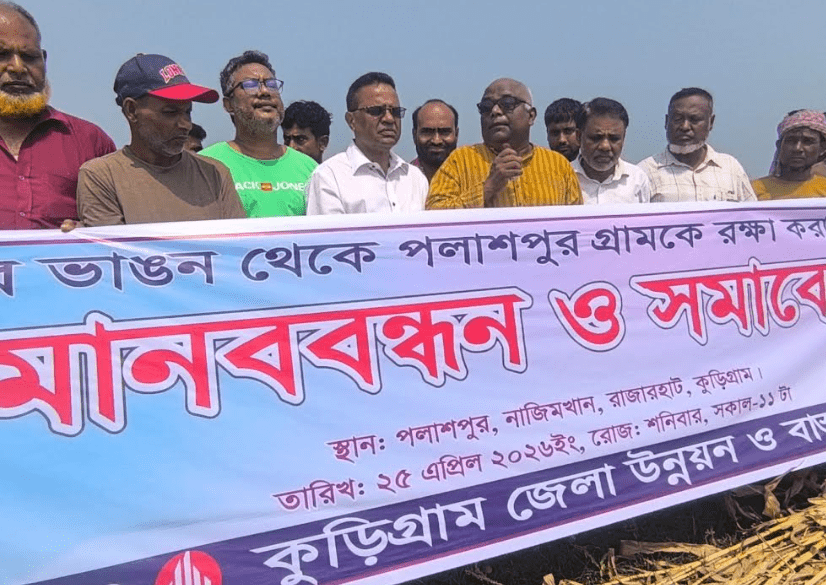 তিস্তা নদীর ভাঙনে বসতভিটা ও আবাদি জমি হারানো ক্ষতিগ্রস্তদের ক্ষতিপূরণ এবং কুড়িগ্রামের রাজারহাট উপজেলার নাজিমখান ইউনিয়নের পলাশপুর গ্রাম রক্ষার দাবিতে মানববন্ধন ও সমাবেশ করেছেন এলাকাবাসী।