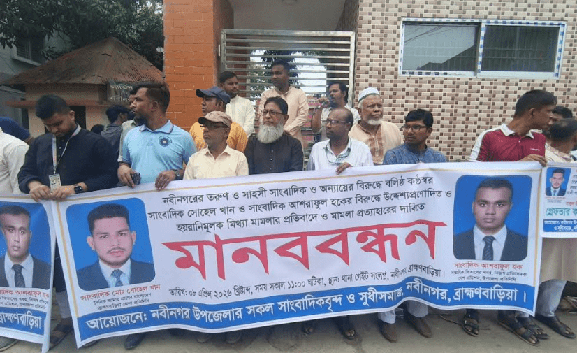 ৮ এপ্রিল ২০২৬ খ্রিষ্টাব্দ, বুধবার সকালে উপজেলার সকল সাংবাদিকবৃন্দ ও সুধী সমাজের ব্যানারে উপজেলা স্ব্যাস্থ কমপ্লেক্স রোডে নবীনগর থানার সামনে এ মানববন্ধনটি অনুষ্ঠিত হয়েছে।