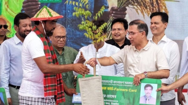 পহেলা বৈশাখে কৃষক কার্ড উদ্বোধন করেন প্রধানমন্ত্রী তারেক রহমান। টাঙ্গাইলের শহীদ মারুফ স্টেডিয়ামে আয়োজিত কৃষক কার্ড বিতরণের উদ্বোধনী অনুষ্ঠানে প্রধানমন্ত্রীর হাত থেকে কৃষক কার্ড গ্রহণ করেন এক ব্যক্তি, যাকে ঘিরে
