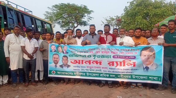 ব্রাহ্মণবাড়িয়ার নবীনগরে ব্যাটারিচালিত অটোরিক্সা, সিএনজি ও তিন চাকার যানবাহনে এডভোকেট এম এ মান্নান এমপির নির্দেশনায় পৌরসভার ইজারা মওকুফ করায় আনন্দ র্যালি করেছেন উপজেলা শ্রমিক দল ও অঙ্গ-সংগঠনের নেতাকর্মীরা। এতে উপস্থিত
